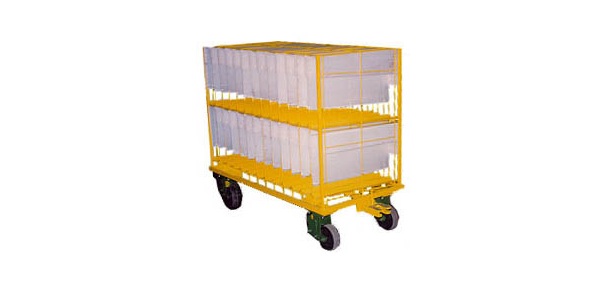 Carro com estrutura metálica para acondicionamento de radiadores, com engates para comboio, rodízios especiais com molas, separadores especiais de acordo com o modelo a ser acondicionado.