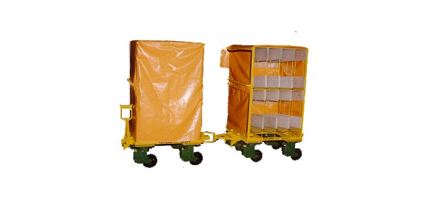 Carro com estrutura metálica, assoalho em chapa de aço com engates para comboio, rodízios especiais com molas, dimensões e capacidade a ser definida de acordo com as necessidades do cliente, podendo ser desenvolvido colméia em polionda para separação e capa em vinilona.