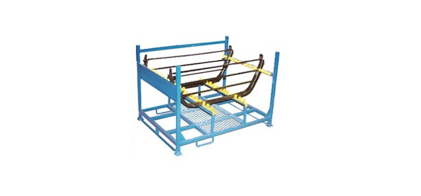 Estrutura tubular empilhável, com pentes separadores acolchoados, nos locais a serem determinados, tiras lisas de apoio e sistema de trava e encaixe de peças sob medida.